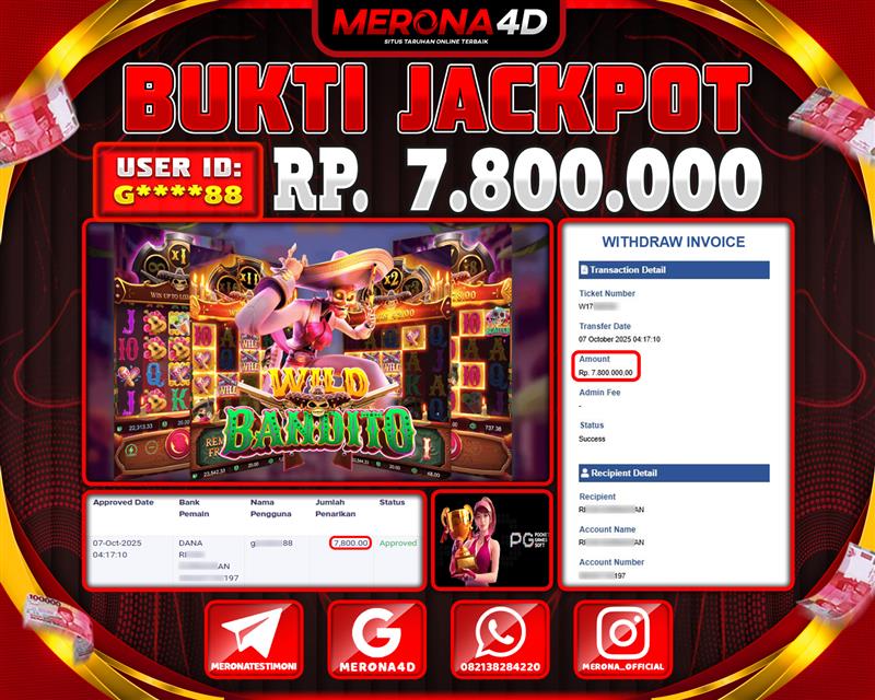 Selamat Kepada Member MERONA4D G*****88 Telah Jackpot Di WILD BANDITO