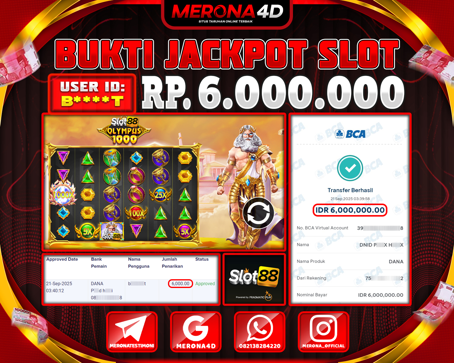 Selamat Kepada Member MERONA4D B****T Telah Jackpot Di SLOT88 OLYMPUS 1000