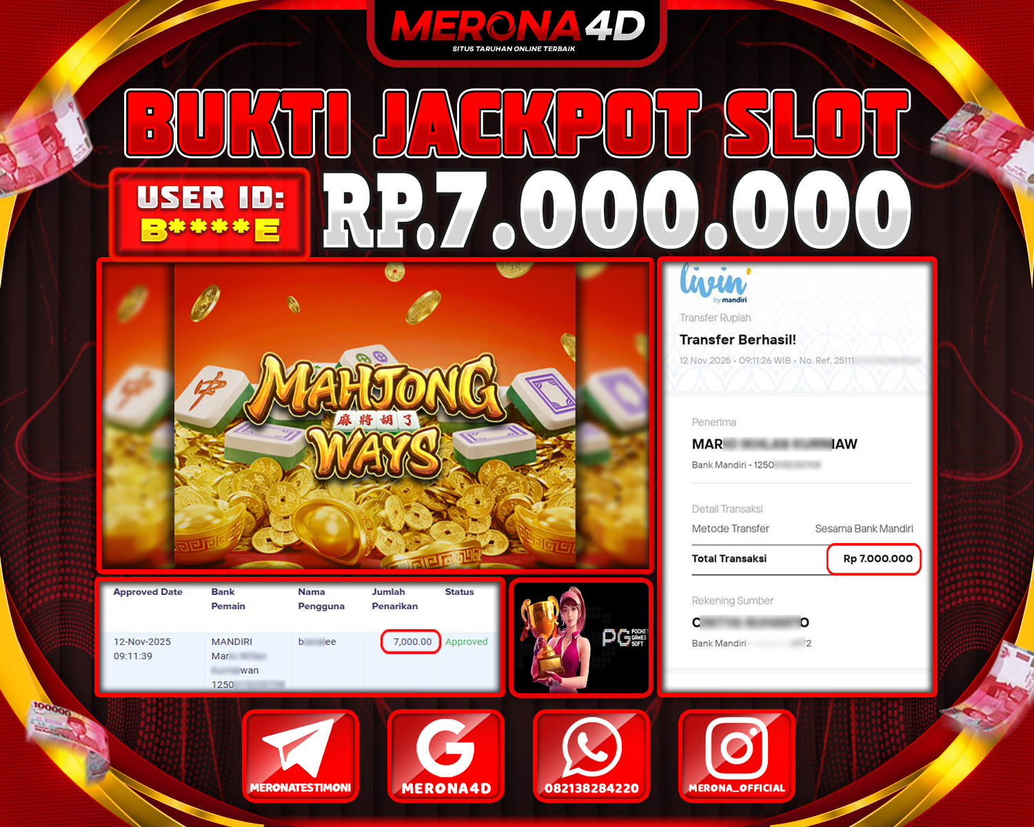 Selamat Kepada Member MERONA4D B⭑�***�⭑E Telah Jackpot Di MAHJONG WAYS