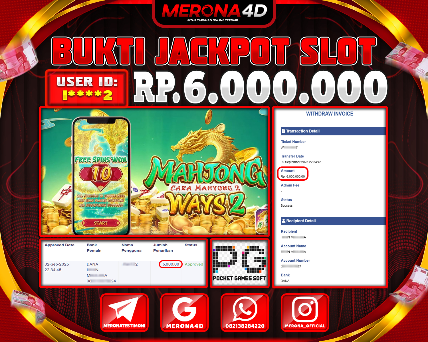 Selamat Kepada Member MERONA4D I****2 Telah Jackpot Di MAHJONG WAYS 2