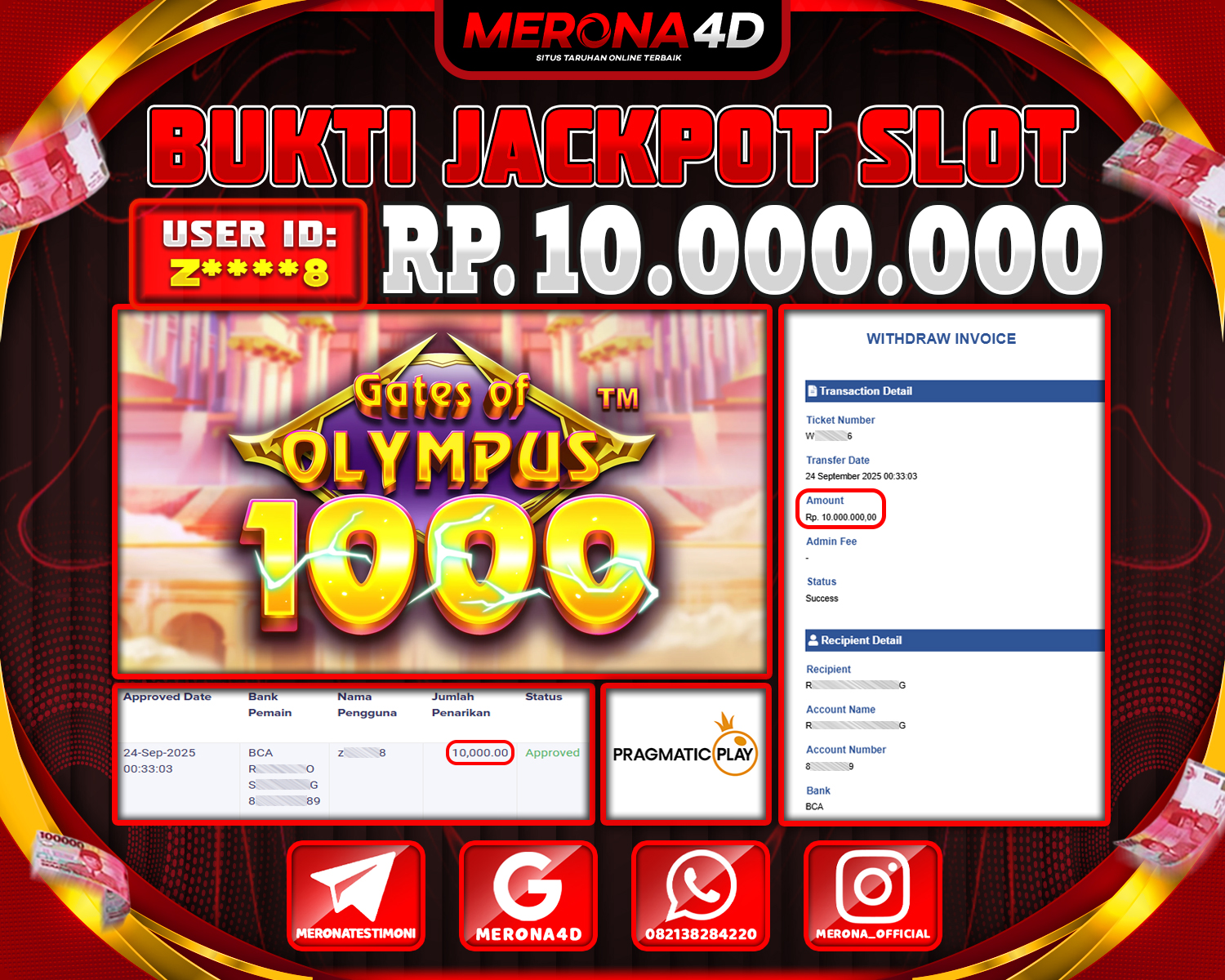 Selamat Kepada Member MERONA4D Z****8 Telah Jackpot Di GATES OF OLYMPUS 1000