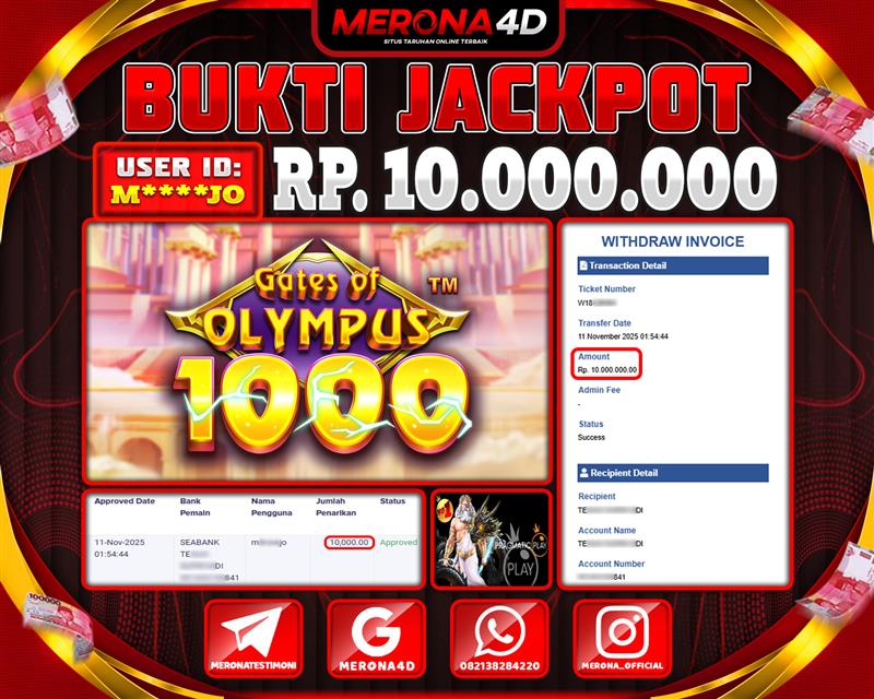 Selamat Kepada Member MERONA4D M*****JO Telah Jackpot Di GATES OF OLYMPUS 1000