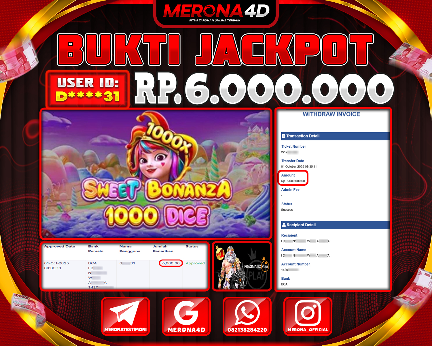 Selamat Kepada Member MERONA4D D*****1 Telah Jackpot Di SWEET BONANZA 1000 DICE