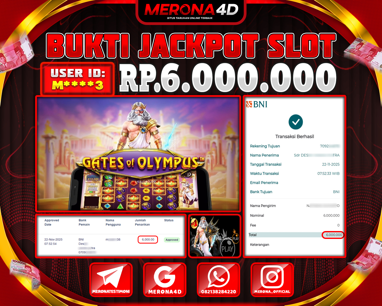 Selamat Kepada Member MERONA4D M*****3 Telah Jackpot Di GATES OF OLYMPUS