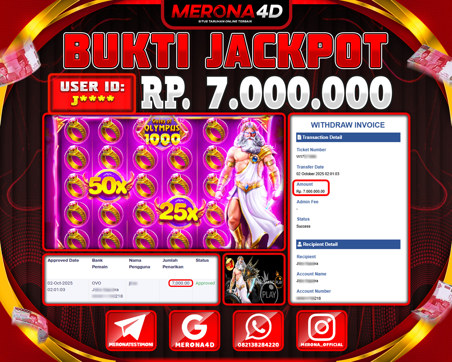 Selamat Kepada Member MERONA4D R*****01 Telah Jackpot Di GATES OF OLYMPUS 1000