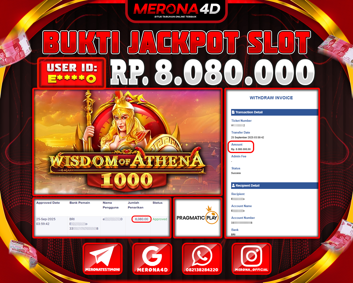 Selamat Kepada Member MERONA4D E****O Telah Jackpot Di WISDOM OF ATHENA 1000