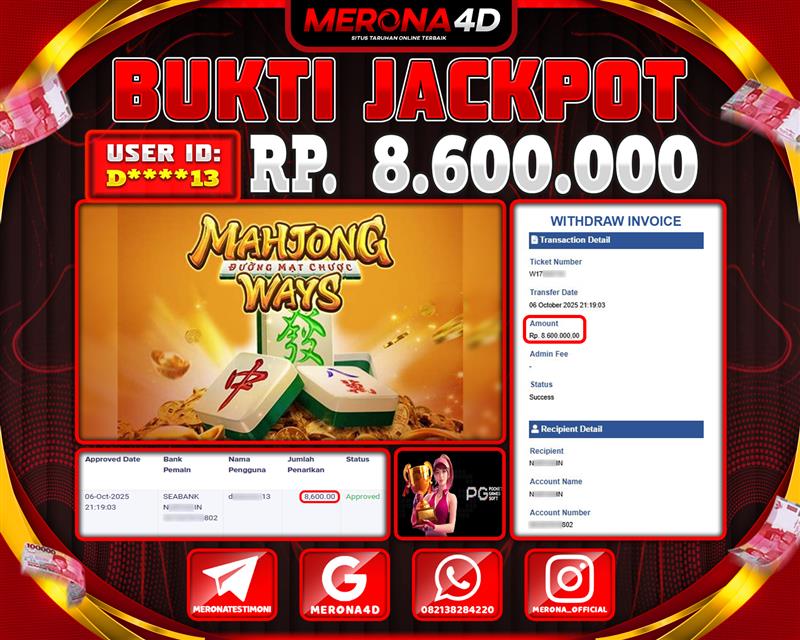 Selamat Kepada Member MERONA4D D*****13 Telah Jackpot Di MAHJONG WAYS