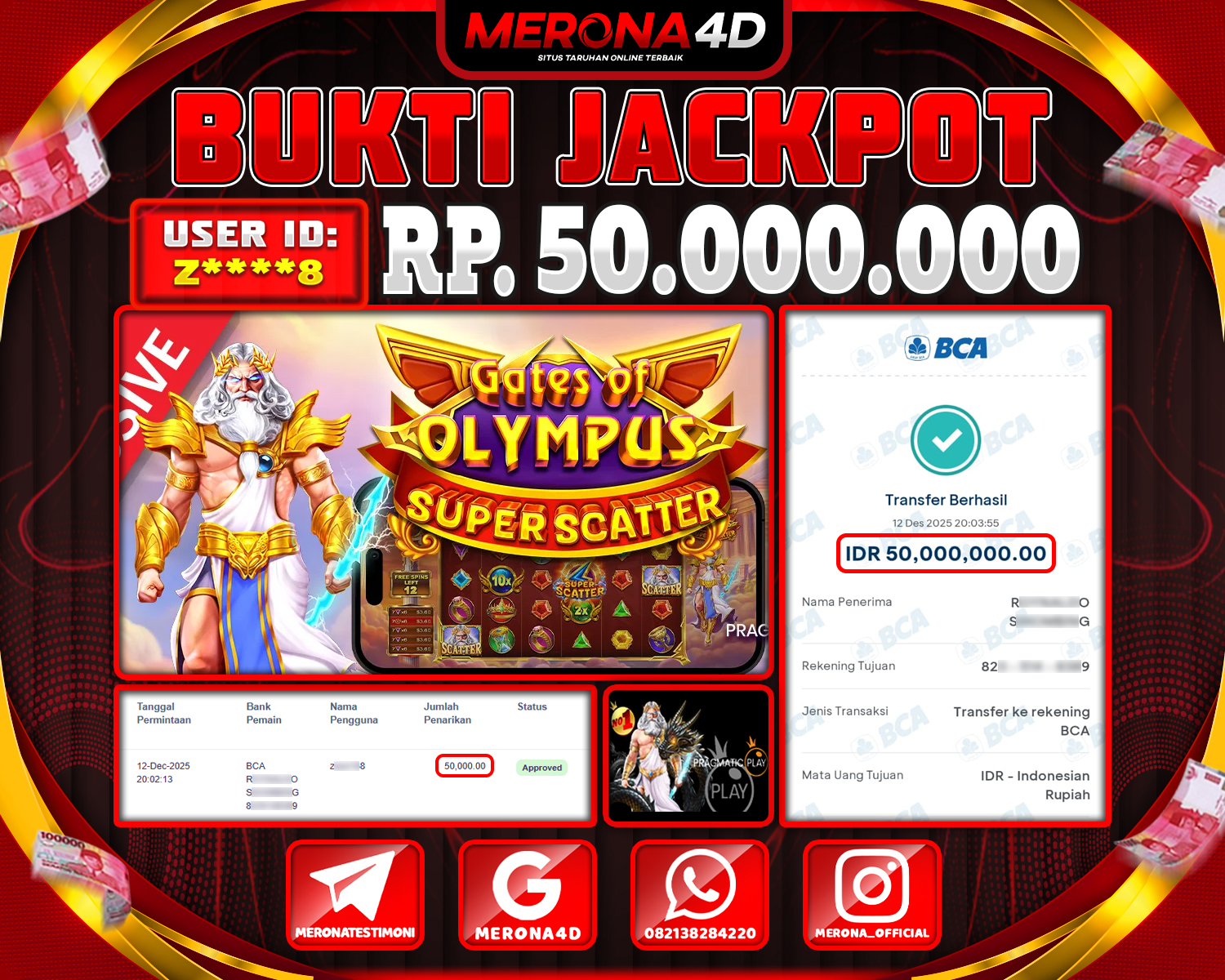 Selamat Kepada Member MERONA4D Z*****8 Telah Jackpot Di GATES OF OLYMPUS SUPER SCATTER