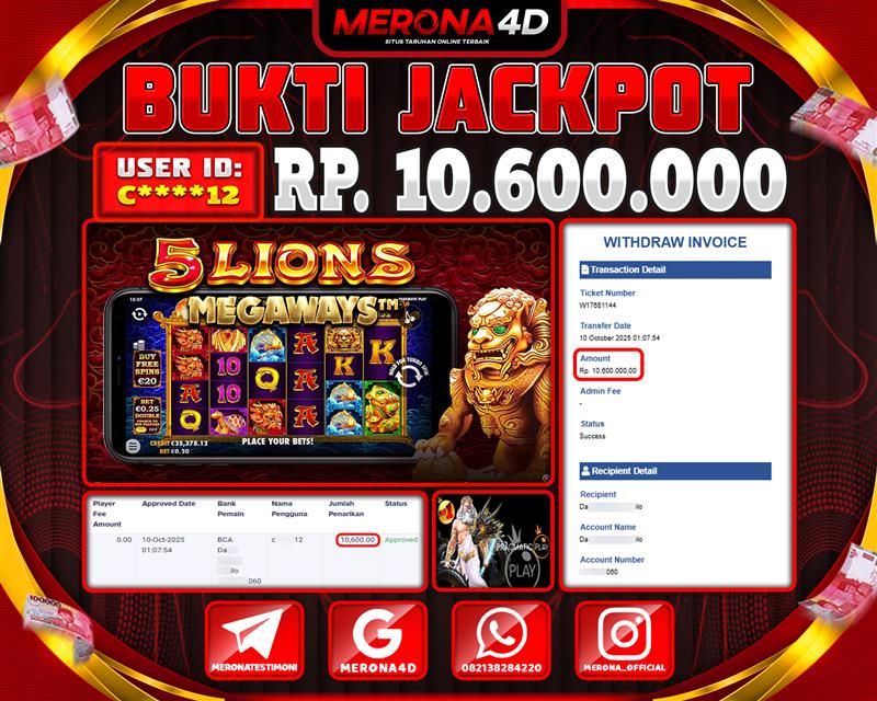 Selamat Kepada Member MERONA4D C*****12 Telah Jackpot Di 5 LIONS MEGAWAYS