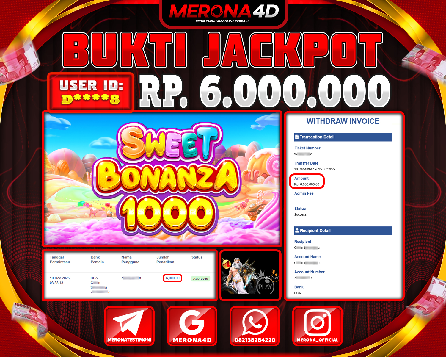 Selamat Kepada Member MERONA4D D****8 Telah Jackpot Di SWEET BONANZA 1000