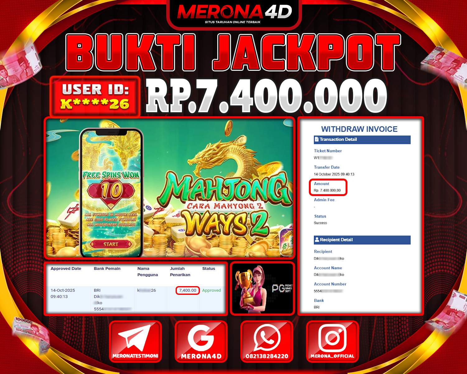 Selamat Kepada Member MERONA4D M*****3 Telah Jackpot Di MAHJONG WAYS