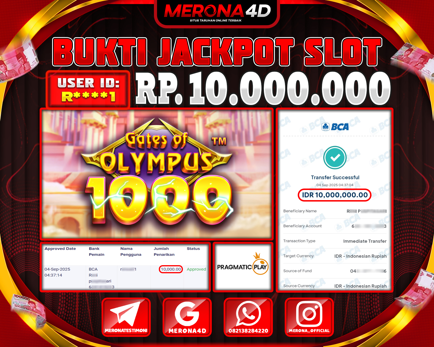 Selamat Kepada Member MERONA4D R****1 Telah Jackpot Di GATES OF OLYMPUS 1000