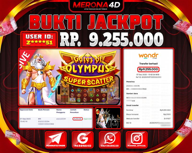 Selamat Kepada Member MERONA4D Z*****51 Telah Jackpot Di GATES OF OLYMPUS SUPER SCATTER