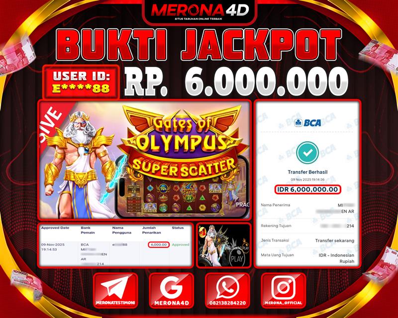 Selamat Kepada Member MERONA4D E*****88 Telah Jackpot Di GATES OF OLYMPUS SUPER SCATTER