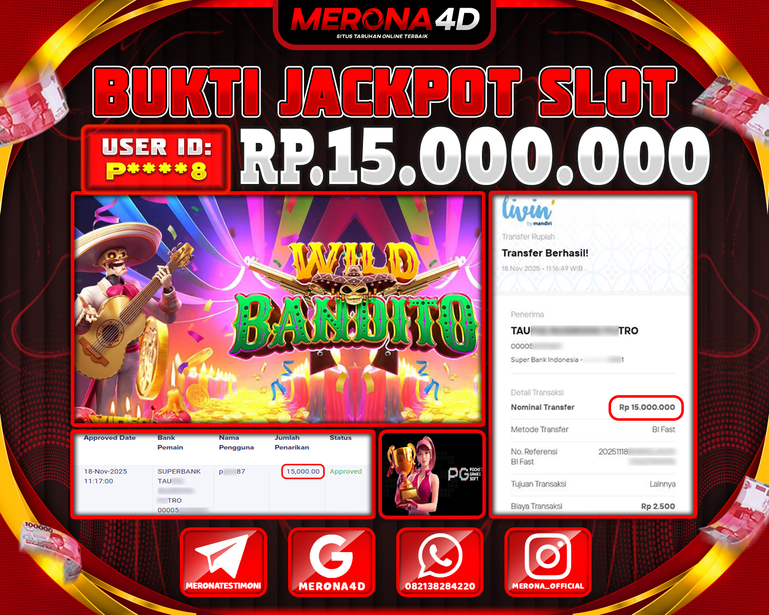 Selamat Kepada Member MERONA4D P****8 Telah Jackpot Di WILD BANDITO