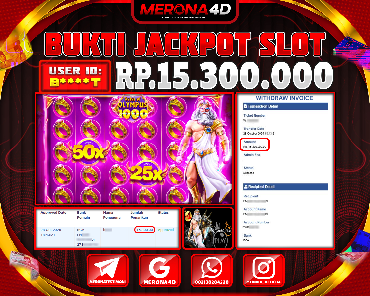 Selamat Kepada Member MERONA4D B*****23 Telah Jackpot Di GATES OF OLYMPUS SUPER SCATTER