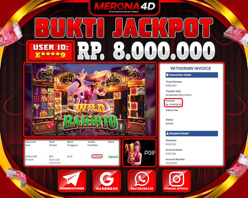 Selamat Kepada Member MERONA4D E*****9 Telah Jackpot Di WILD BANDITO