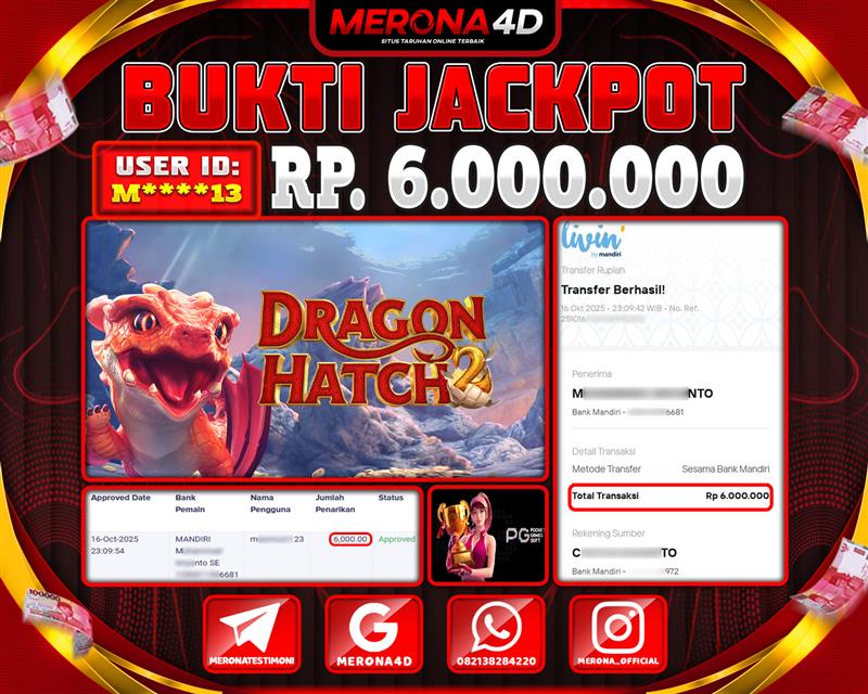 Selamat Kepada Member MERONA4D M*****13 Telah Jackpot Di DRAGON HATCH 2