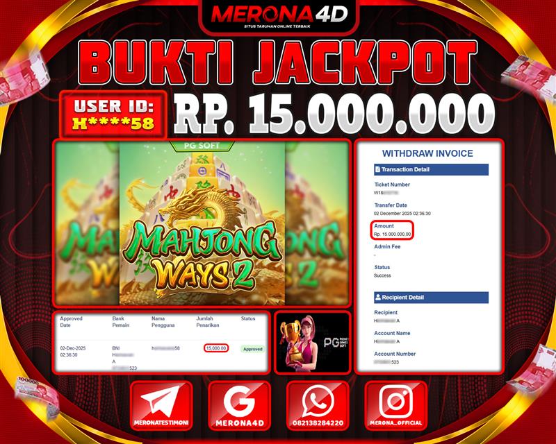 Selamat Kepada Member MERONA4D H*****58 Telah Jackpot Di MAHJONG WAYS 2