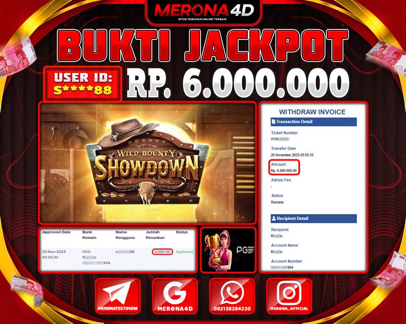 Selamat Kepada Member MERONA4D S*****88 Telah Jackpot Di WILD BOUNTY SHOWDOWN