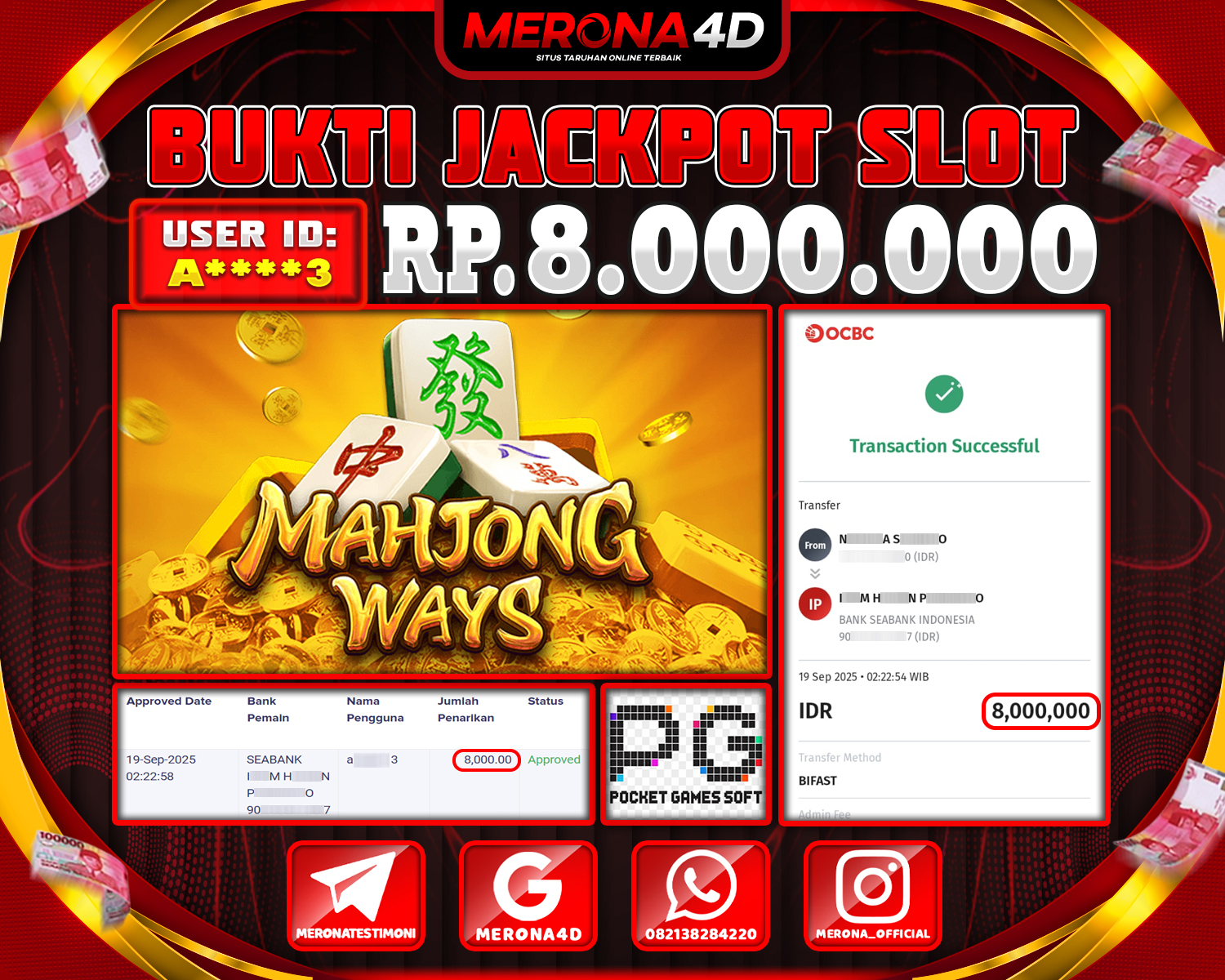 Selamat Kepada Member MERONA4D A****3 Telah Jackpot Di MAHJONG WAYS