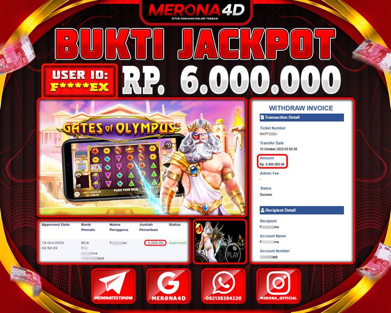 Selamat Kepada Member MERONA4D A*****64 Telah Jackpot Di GATES OF OLYMPUS 1000