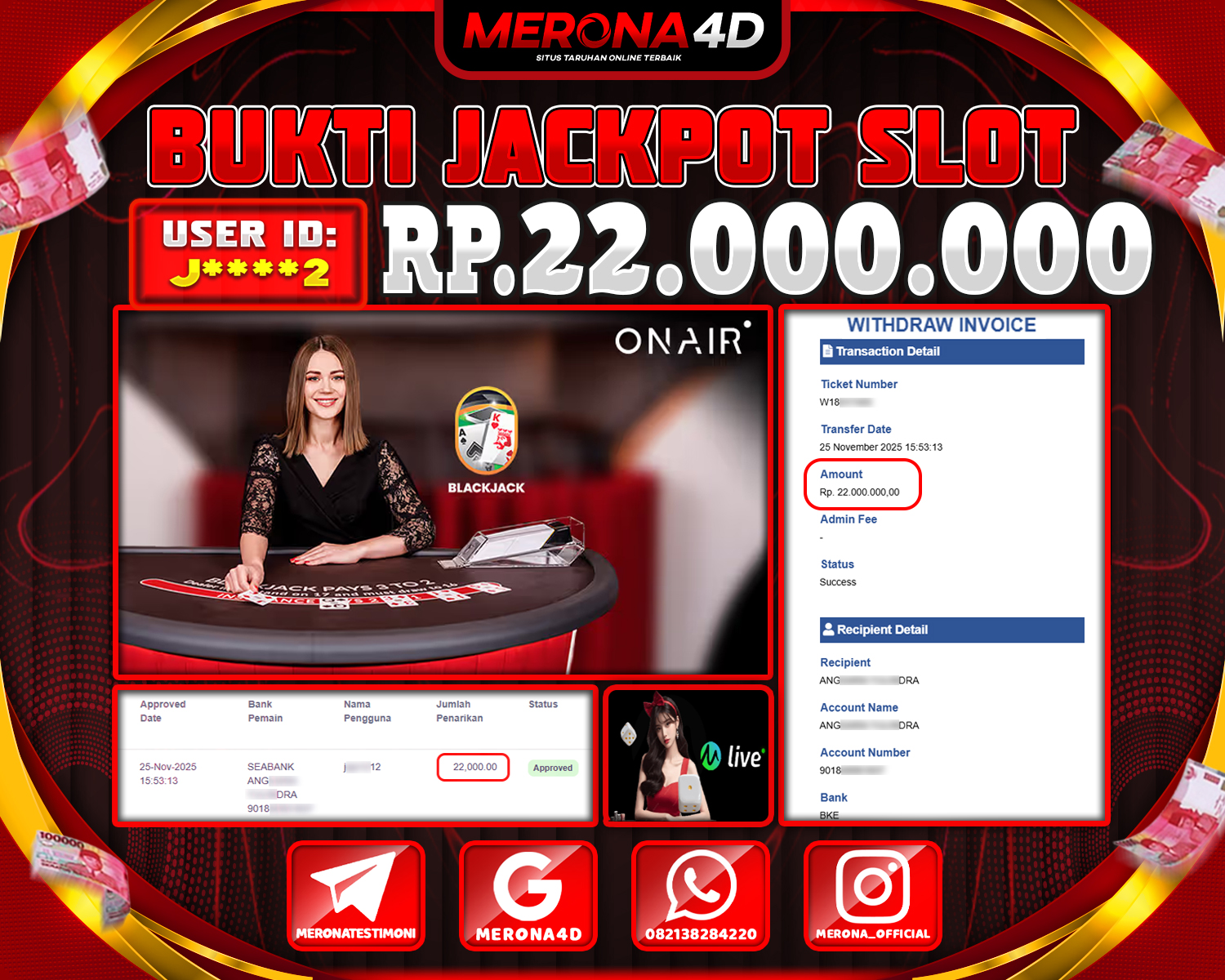 Selamat Kepada Member MERONA4D J****2 Telah Jackpot Di BLACKJACKRIGA